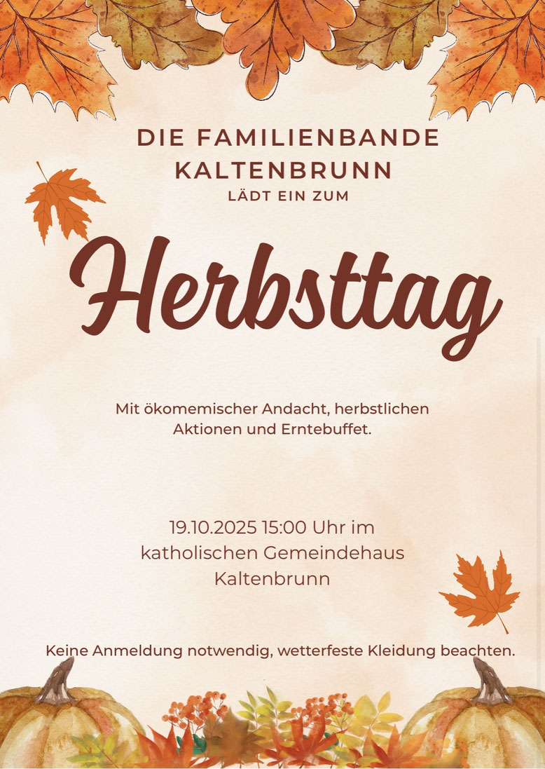 Die Familienbande Kaltenbrunn lädt ein zum Herbsttag am Sonntag, den 19.10.2025 im katholischen Gemeindehaus (befindet sich hinter der